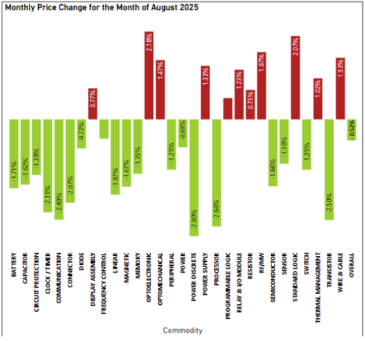 The commodities pushing upward against this trend include Optoelectronic (up 2.18% month-to-month), Standard Logic (up 2.07%), and RF/MW (up 1.67% month-to-month).
