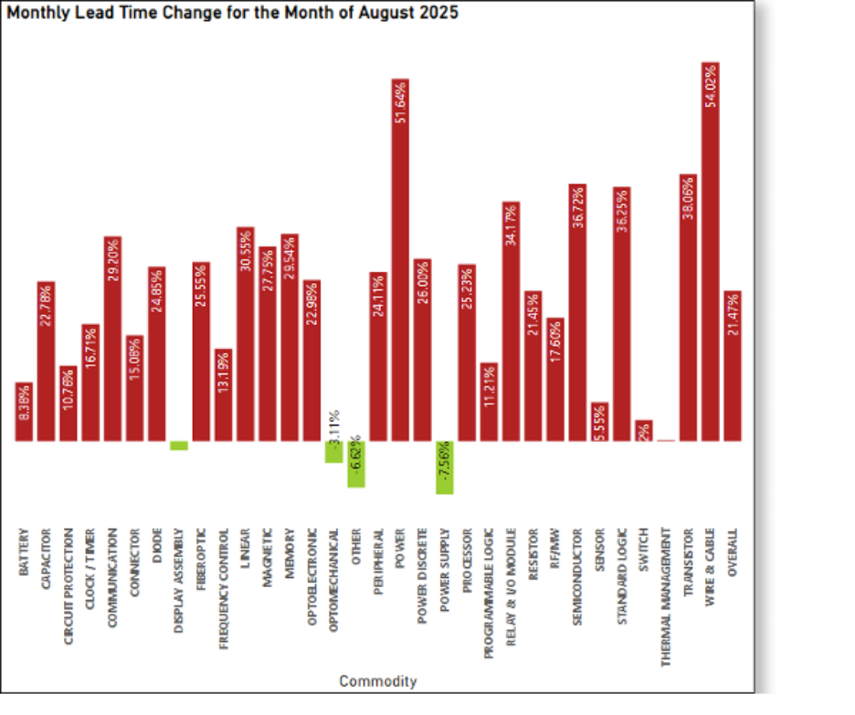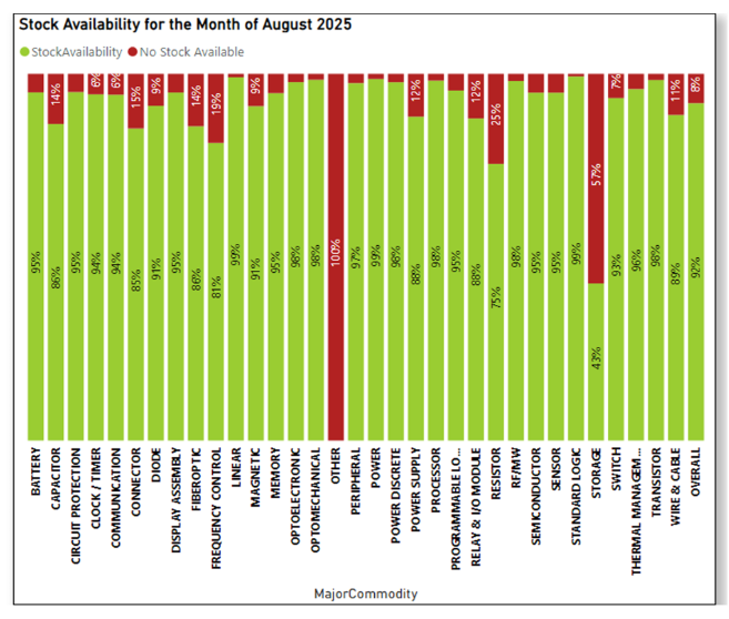 For the fifth consecutive month, stock availability has remained consistent at 92% available. This consistency continues the broader trend, suggesting that inventory positions remain healthy for buyers. Minimal changes were observed across the commodity categories compared to July, further reinforcing a stable supply environment. Those components leading the way from an availability perspective include Standard Logic (99% available), Power (99% available), and Linear (99% available).