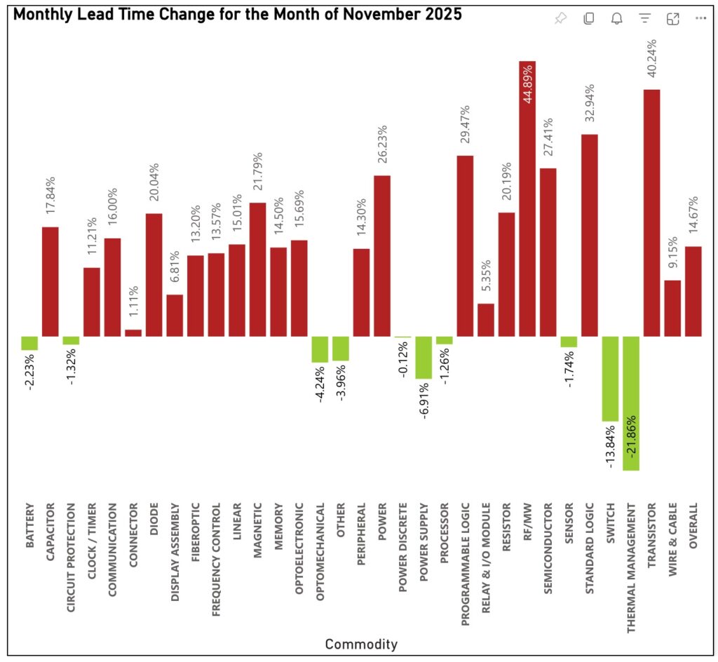 Upward pressure persisted across RF/MW (Radio Frequency/ Microwave), increasing 44.89%, transistors increasing 40.24% month over month, and standard logic increasing 32.94% month over month, with only limited relief in select categories, such as thermal management at –21.86% month over month, switches decreasing lead time by –13.84% month over month and power supply decreasing at -6.91% month over month.