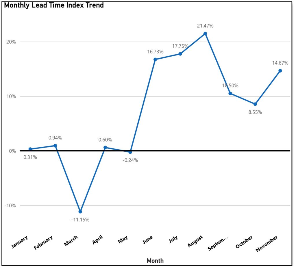 The lead time index trend shows a sharp escalation beginning in June, rising from 16.73% to 21.47% in August, then easing slightly through September and October. However, by year-end, we see that the index trend for lead time is elevated to 14.67% in November.