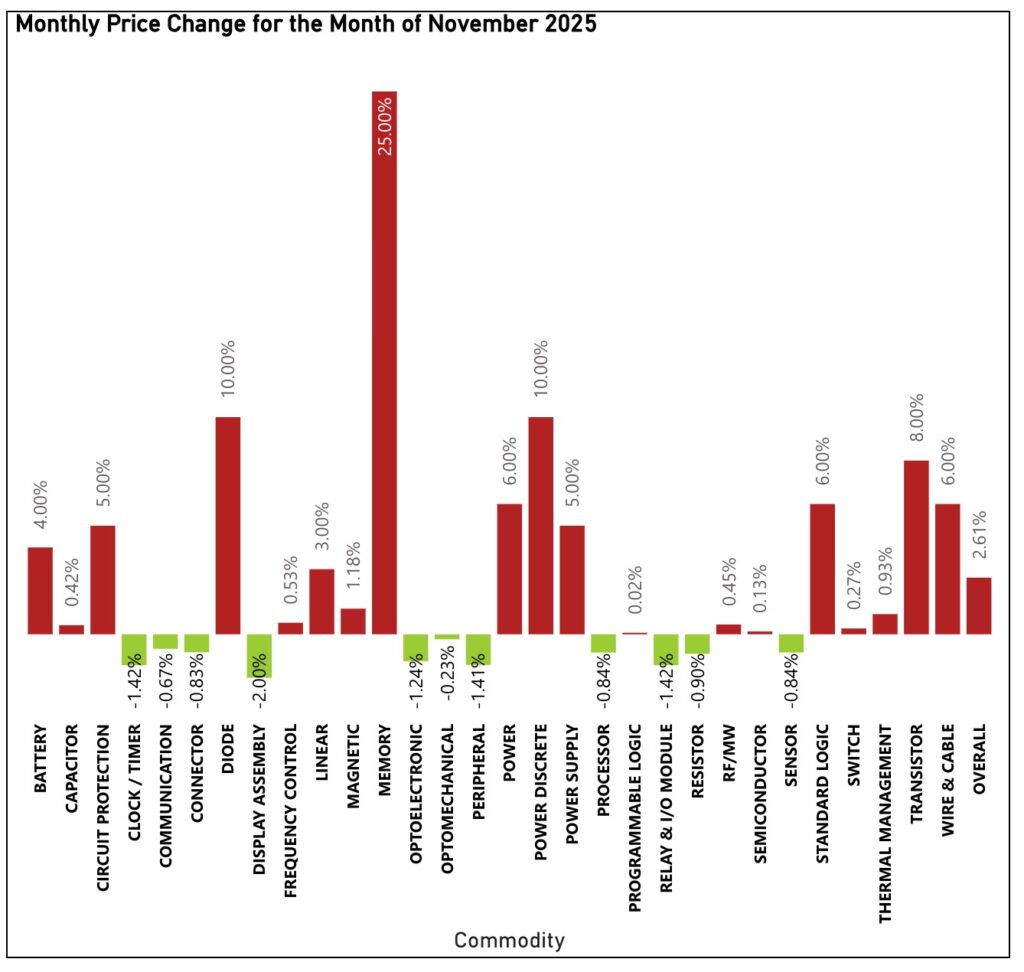 November marked a clear acceleration in pricing across the electronic components market. The overall pricing index rose 2.61% month over month, the largest increase of 2025 and the third consecutive month of gains following September and October’s inflection.