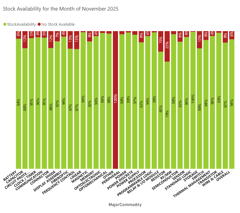 In November, stock availability remained high at 94% overall, reflecting a stable supply environment across most component categories. Several major commodities continued to show strong availability, including Standard Logic (100%), Power (99%), Linear (99%), Optoelectronic (99%), Programmable Logic (99%), and Transistors (99%). Other categories also remained elevated, including Radio Frequency/Microwave (RF/MW +98%), Power Discretes (97%), and Sensors (96%).